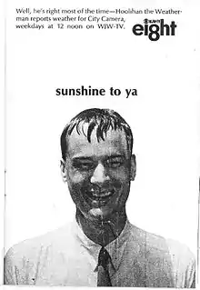 In 1965, Wells moved to Cleveland to replace Howard Hoffman as the 6 and 11 PM evening weatherman on WJW-TV Channel 8, then the local CBS affiliate, as "Hoolihan the Weatherman." WJW management was seeking a "funny" weatherman to contrast with the "serious" style of other local weather presenters, including Dick Goddard of WKYC, Don Webster of WEWS, and the departing Hoffman. Wells got the job by dressing up in a grass skirt and improvising a humorous audition. Station management named him "Hoolihan the Weatherman" and the name stuck. Wells' presentations, which included jokes and always ended with "Hoolihan's" catch phrase "Sunshine to you, no matter what the weather," achieved #1 in the local ratings. Despite this success, a year later when WJW had the opportunity to hire Dick Goddard, the station gave Goddard the weeknight time slots and moved Wells to noon and weekend weathercasts.[2][8][12]