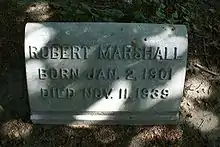 While on a midnight train from Washington, D.C. to New York City on November 11, 1939, Marshall died of apparent heart failure at the age of 38.[3] His sudden death came as a shock because of his relatively young age and high level of physical activity. He was greatly mourned by friends and relatives. His brother George (who lived to be 96) said: "Bob's death shattered me and was the most traumatic event in my life."[74] Marshall was interred at Salem Fields Cemetery, a Jewish burial ground in Brooklyn, New York City, beside his parents and sister Ruth (Putey) Marshall, who had died of congestive heart failure at age 38 in 1936.