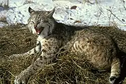 The adult bobcat has relatively few predators. However rarely, it may be killed in interspecific conflict by several larger predators or fall prey to them. Cougars and gray wolves can kill adult bobcats, a behavior repeatedly observed in Yellowstone National Park.[71][72] Coyotes have killed adult bobcats and kittens.[73][74][75] At least one confirmed observation of a bobcat and an American black bear (Ursus americanus) fighting over a carcass is confirmed.[76] Like other Lynx species, bobcats probably avoid encounters with bears, in part because they are likely to lose kills to them or may rarely be attacked by them.[77][78] Bobcat remains have occasionally been found in the resting sites of male fishers.[79] American alligators (Alligator mississippensis) have been filmed opportunistically preying on adult bobcats in the southeast United States.[80][81] Golden eagles (Aquila chrysaetos) have been reportedly observed preying on bobcats.[82]