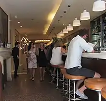 Cleevely had purchased the freehold on the small site for about two and a half million pounds, taking the view that if a prime site was required, the huge risks of founding a new restaurant meant that it was better to own the property asset outright rather than enter into an expensive and difficult-to-end lease.[2] The restaurant has a long Carrara marble bar for lighter meals, overlooking an open-plan kitchen, with the windowless main dining room at the back[5] as well as a separate room that can be booked for private functions.[7] It is decorated with large still-life paintings by Kenedy's mother, artist Haide Becker.[8] Bocca di Lupo has been described as "small and slightly chaotic", with only fourteen tables.[4]
