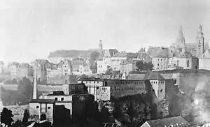 It was in 963 that Count Siegfried, in search of a site from which he could defend his properties, obtained the Bock and its surroundings from St Maximin's Abbey in Trier in exchange for the land he owned at Feulen in the Ardennes to the north. The Romans, then the Franks, had probably already inhabited the Bock although there is only scant archeological evidence of their presence.[1][2] There are however traces of a 4th-century Roman watchtower close to the point in the Fish Market where two major Roman roads used to cross, one from Reims to Trier and the other from Metz to Liège.[3]