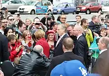 Angela Merkel flanked by her bodyguards as she mingles with a crowd