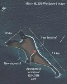 - 20 December 2016: A series of short nearly-daily volcanic eruptions started, producing towering volcanic ash clouds and volcanic lightning, changing the geography of the island. As there are no cameras or monitoring stations on the island and the area is usually overcast, details were uncertain. However, when the weather became favorable, it was seen that a small vent slightly offshore of Bogoslof's northeast beach had erupted explosively, fracturing the original island in two, and forming a new, smaller island to the northeast.[7]