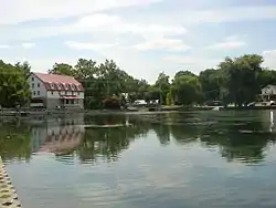 This 7-acre (2.8 ha) body of water was formed by partially damming the brook fed from 30 natural springs, including the "Bubble". Children's Lake is home to many ducks, swans, and geese throughout the year. The lake dates to the 1750s when the dam was used to provide water power for iron production. In the mid-18th century, a grist mill was built by Michael Ege on the southeast shore of the lake, to provide flour and grain for the iron works. This building has been converted into apartments. On January 29, 2022, a fire occurred and caused significant damage to the mill building.[7]