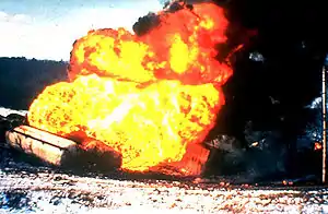 If the substance involved is flammable, it is likely that the resulting cloud of the substance will ignite after the BLEVE has occurred, forming a fireball and possibly a fuel-air explosion, also termed a vapor cloud explosion (VCE). If the materials are toxic, a large area will be contaminated.[6]