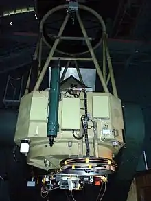 There are currently 3 instruments that are mainly used at the 90-inch, two that work in the optical and one in the near-IR. The 90prime instrument, whose principal investigator is Edward Olszewski, is a prime focus, wide-field imager capable of imaging 1 square degree on the sky, while the B&C Spectrograph does spectroscopy. The Steward 256x256 NIR Camera, which has been available at the telescope since 1991,[4] uses a NICMOS array which was built during the development of the NICMOS instrument on the HST. The 90-inch is also fitted with an eyepiece for direct viewing by a human observer, uncharacteristic for telescopes of this size.[1]