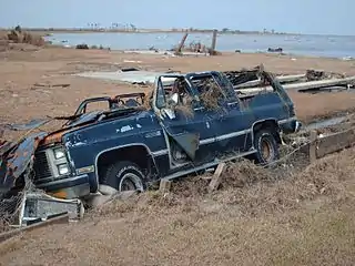 Hurricane Ike caused cataclysmic destruction of the peninsula, reducing the region to rubble and causing severe, permanent change in the shoreline. Entire communities along the upper Texas coast were simply wiped out by Ike's catastrophic storm surge.[24] Ike's effects were disproportionally felt near the long, low-lying Bolivar Peninsula which has typical elevations around 2 m. Despite being only a strong category 2 storm with maximum winds at landfall of 95 knots (49 m/s, Berg, 2009), Ike's extremely large, long-lasting surge and waves devastated the peninsula.[23] In Gilchrist, Texas, NOAA aerial photography reveals complete destruction. The Rollover Pass bridge was reduced to one lane. Of the 1,000 buildings in Gilchrist, 99.5% of them were knocked off of their foundations. Of the buildings off of the foundations, the storm demolished some and washed others onto swamplands behind Gilchrist.[25]