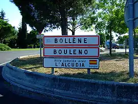 ![]() Entrance of Bollène. The second sign shows the town name in Provençal. The third one its twin town. | |