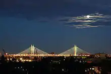 The Bolshoy Obukhovsky Bridge (Russian: Большо́й Обу́ховский мост, Bolshoy Obukhovsky most) is the newest (not taking into account the Blagoveshchensky Bridge rebuilt in 2007) bridge across the Neva River in Saint Petersburg, Russia. It is the only bridge across the Neva which is not a drawbridge. One of the longest bridges in Russia, it is the first fixed bridge and largest bridge across the Neva. Of course it is the largest bridge in St. Petersburg by the size of the covered span (382 m).[1] It is located in Nevsky District, in the middle stream of the Neva. It connects Obukhovskaya Oborony Avenue with the Oktyabrskaya embankment. It is a cable-stayed bridge; the steel wire ropes are the key element of the supporting construction. But what looks like a bridge is actually two identical twin bridges with opposite directions of movement along them. One is located upstream of the Neva (southern) and is for driving eastward, the other downstream (north) is for driving in a western direction.