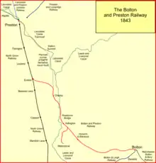 In 1838 the North Union Railway opened its line from Parkside to Preston.[1] Bolton and Preston had important commercial connections but the rail route between them involved a circuitous journey using the Bolton and Leigh Railway to Kenyon Junction and Parkside and the North Union Railway. A direct railway was proposed and a company was formed in 1836. The first chairman was Thomas Ridgway, a Horwich bleacher, and the chief engineer appointed to survey the line was John Urpeth Rastrick.[2]