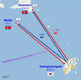 In an effort to assert its territorial claims, North Korea has pursued a strategy of challenging South Korean control of the waters south of the NLL. It has made several incursions that have sparked clashes between the two sides, notably a naval battle near Yeonpyeong island in 1999 as well as another engagement in the same area in 2002.[20] Although there were no further serious clashes for a time, in 2009 increasing tensions along the disputed border led to a naval battle near the island of Daecheong, and accusations that a North Korean submarine had sunk the South Korean corvette Cheonan off Baengnyeong Island in March 2010.[21][22]