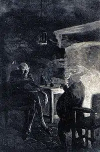 Pierre Bon-Bon is a well-known French restaurant owner and chef, known both for his omelettes and his metaphysical philosophies. The narrator describes him as profound and a man of genius, as even the man's cat knew. Bon-Bon, who has "an inclination for the bottle", is drinking around midnight on a snowy winter night when he hears a voice. He recognizes it as that of the Devil himself, who then appears in a black suit in the style of the previous century, and which is a bit too small for him. He wears green spectacles, and has a stylus behind one ear and a large black book in his breast pocket.