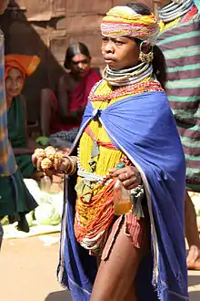 The Bonda are a scheduled tribe of India and are also known as the Remo (meaning "people" in the Bonda language). The tribe is one of the oldest and most primitive in mainland India; their culture has changed little for more than a thousand years. They are one of the 75 Primitive Tribal Groups identified by the Government of India.[7] Their isolation and known aggressiveness continue to preserve their culture despite the pressures of an expanding Indian population. Their language belongs to the Munda branch of the Austroasiatic language family. It is most closely related to the Gutob language.[8]