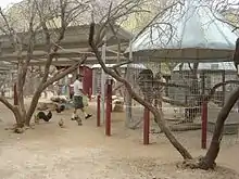 By 1997, the zoo included bobcats, burros, coatimundi and lynx, coyotes, ferrets, hedgehogs, llamas, porcupines, prairie dogs, squirrels, turtles, and a woodchuck.[13] Emus would also be added to the zoo, including one that had been abandoned in the desert.[17] Peacocks and deer freely roamed the fenced zoo area. The ranch also featured a large stable of horses.[6][108] Levinson raised several of the animals.[21] Most of the zoo was occupied by rescued animals who had been mistreated.[42] The petting zoo included goats, deer, sheep, and buffalo.[109][2] Some of the animals could naturally withstand the local heat, while others had covered enclosures with misters and bodies of water. To stay cool, the animals were also regularly given ice packs.[110]