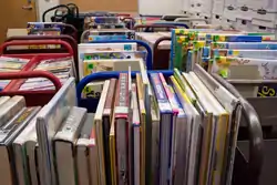 A book truck, book trolley, or book cart is a small wheeled vehicle, typically with two or three shelves, used in libraries to move books.[1]