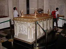 The display case for the first Book was designed by John A. Pearson, architect of the Peace Tower, and made by Bromsgrove Guild Limited (Great Britain) and Robert Mitchell Company in 1928. Made of bronze, enamel and other metals, it is decorated with four kneeling angels and a ribbon encircling a laurel.[3] It rests on an altar of English Hoptonwood limestone that was a British gift to Canada, situated at the centre of the chamber.[2] Later books are displayed on altars of Hoptonwood stone and bronze, decorated with poppies, located against the walls of the chamber.[2]