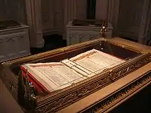 The eight Books of Remembrance housed in the Memorial Chamber in the Peace Tower of the Canadian Parliament Buildings in Ottawa are illuminated manuscript volumes recording the names of members of the Canadian Forces and Canadian Merchant Navy killed on active service in wartime, and in other conflicts.[1] There are eight separate Books, beginning with the first to be commissioned listing the names of the dead from the First World War.[2]