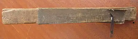 The clicker's knife regularly needed sharpening, which was done with an implement called a rap stick. To use a rap stick, a right-handed operator would hold it in the left hand, resting the stick on the workbench for support, stroking the blade rapidly but gently back and forth on the abrasive surface to maintain a sharp edge whilst hand-cutting, in a similar fashion to a butcher's knife and sharpening steel. The knife blade shown is a lighter medical item but approximates the shape of a clicker's knife blade, fitting into a comfortable wooden handle with screw-activated jaws.[1] The main surface is emery cloth wrapped over the edge to form a round section where the curved blade can nestle and be sharpened; the top edge is sharper and square in cross-section, with a fine-grain aluminium oxide abrasive strip used for tip-sharpening. On the reverse side is a heavy-leather smooth strop, to address any metal burrs left by the abrasive process.[2]