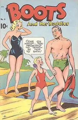 The Sunday strip began as a topper, positioned above Our Boarding House from 1926 to 1931. Because the strip had a large readership of college and high school students, Martin kept Boots in college for a very long time.[1][2] With the strip's emphasis on fashion and beauty, Martin was sometimes invited to judge beauty contests. Paper doll cutouts with fashionable garments were a part of the Sunday pages well into the early 1960s. Associated topper strips were The Gooneys, Babe 'n Horace (started March 19, 1939) and Bootkins: the Little China Doll (April 26, 1936 to March 13, 1938).[1][2] Interviewed in 1952, Martin gave some background on the strip and the way he felt about his characters: