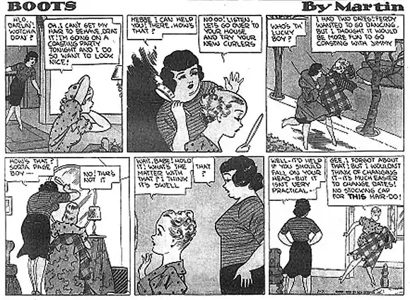 - In 1926, after monied brother Bill gave her a trip to New York, she got a new haircut, the "Boots Bob," which clicked nationally with hairdressers. She was, in 1939, honored guest, in sketch form, at the Yale junior prom, and her glamour brought artist Martin several assignments as judge of beauty contests. Boots picked up a chum, Babe in these days, and they had a strong following among the students. But as the original audience grew older, Boots matured. She was courted by numerous swains. It's like ticking off calendars to recall their names—Ronald Ross, Prince Franz of Grandalia, Jonathon Marlsboro Jones, Handy Andrews, the wealthy Cecil Livingston and Rod Ruggles. Boots' audience had apparently reached a new stage when Ruggles appeared on the scene. They liked him. They sent a cascade of letters asking for wedding bells, and Boots and Rod went to the altar, October 2, 1945.[6]