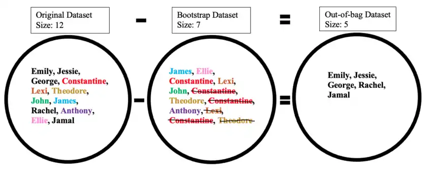 The out-of-bag dataset represents the remaining people who were not in the bootstrap dataset. It can be calculated by taking the difference between the original and the bootstrap datasets. In this case, the remaining samples who were not selected are Emily, Jessie, George, Rachel, and Jamal. Keep in mind that since both datasets are sets, when taking the difference the duplicate names are ignored in the bootstrap dataset. The illustration below shows how the math is done: