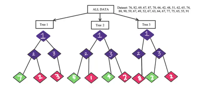 In this example, the result that needs to be determined is whether or not it is summer. This a dataset of temperatures over the course of a month: [76, 82, 69, 67, 87, 70, 66, 42, 48, 51, 62, 65, 74, 88, 90, 59, 67, 49, 52, 67, 63, 64, 67, 77, 75, 65, 55, 91]. This is the dataset used to make the subset of 12 temperatures for each decision tree. In this example, there are 3 generated trees (3 randomized subsets of temperatures). The graphic below displays Decision Tree 1, its subset, along with explanations of how the tree makes its decision and comes to a result.