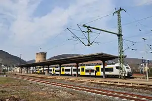 Since the timetable change of 2009, Rhenus Veniro has been the operator of the Hunsrück railway. For this reason, Rhenus Veniro bought the old and dilapidated Bahnmeisterei (the office of the director of track maintenance)[10] from Deutsche Bahn in 2007 and two years later built a shed there for parking and repairing its trains and a carriage washing facility.[11] The tracks of the depot were reconnected to the Deutsche Bahn network at the station.