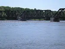 ![]() The Bordeaux Railway Bridge as seen from downstream, the handrails of the footbridge can be seen on the far, upstream, side. | |