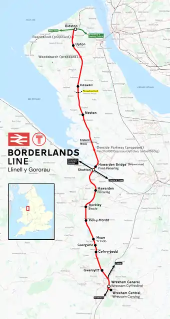 The Borderlands line (Welsh: Llinell y Gororau[lower-roman 1]), also known as the Bidston–Wrexham or Wrexham–Bidston[lower-roman 2] line, is a railway line between Bidston on the Wirral Peninsula in England and Wrexham in the north-east of Wales. The line is part of the Wales & Borders franchise, with passenger train services operated by Transport for Wales Rail, between the northern terminal of Bidston and Wrexham Central in the south. The line connects to the Merseyrail network at Bidston, the North Wales Coast Line at Shotton and the Shrewsbury–Chester line at Wrexham General. Parts of the line in Wales are used by freight trains, serving Deeside Industrial Park and the Hanson Cement works to the south of Buckley.[2][3] The line is part of Transport for Wales' North Wales Metro improvement programme.