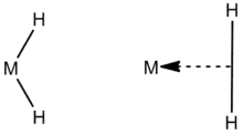 A more recent definition of borderline hydrides refers to hydrides that exist between classic and non-classic dihydrides. The classic form is the dihydride M(H)2 configuration, where the metal is bound to two free hydrogen atoms. The non-classic form contains two hydrogen atoms bound to a central metal atom with an η2-H2 hapticity, indicating that a single coordination point on the metal atom bonds to two contiguous atoms from another molecule, in this case H2.[4] A well-known example of this is from the first such molecule to be synthesized with a coordinated hydrogen ligand (dihydrogen complex): W(CO)3(PPri3)2(η2-H2).[5] Classic dihydrides containing the dihydride M-(H)2 ligands are typically found as a tautomer with the non-classical dihydrogen complexes containing a M-(η2-H2) group.