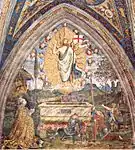 The Room of Mysteries holds the fresco cycle representing the mysteries of the faith, which were thought to have influences Raphael's Disputation of the Holy Sacrament.[1] The biblical scenes displaying the mysteries of faith are painted to inspire a sense of piety in the viewer. Pinturicchio's work in this room is ubiquitous, meant to act as a holy teaching for beginners in religious education. The figures in this room are more restricted in their emotion and motion.[16] The Room of the Mysteries includes The Annunciation, The Nativity, The Adoration of the Magi, and The Resurrection.[17] Pope Alexander VI was a devotee of the Virgin Mary, which is why many of Pinturicchio's episodes in this room were dedicated to her life and legacy.[18] Pope Alexander VI is represented on this fresco cycle, within The Resurrection painting, kneeling at Christ's feet.[8]
