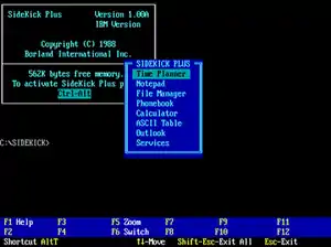 Borland Sidekick was a personal information manager (PIM) launched by American software company Borland in 1984 under Philippe Kahn's leadership. It was an early and popular terminate and stay resident program (TSR) for MS-DOS which enabled computer users to activate the program using a hot key combination (by default: Ctrl-Alt) while working in other programs. Although a text-mode program, Sidekick's window-based interface echoed that of the Apple Macintosh and anticipated the eventual look of Microsoft Windows 2.0. It included a personal calendar, text editor (with WordStar-like command interface), calculator, ASCII chart, address book, and phone dialer. According to the prospectus for Borland's initial public offering of stock to the public, Sidekick sold more than 1 million copies in its first three years.