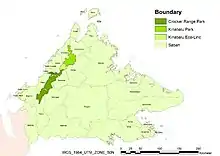 Crocker Range National Park falls within the distribution range of the Bornean ferret badger and plays an important role in its conservation.[1] The park's "national park" status provides protection to the flora and fauna within it, including the Bornean ferret badger.[19] This has and continues to limit the impacts of human encroachment on the Bornean ferret badger's habitat.[7] This is significant to the conservation efforts of the Bornean ferret badger, as Crocker Range National Park is surrounded by numerous settlements of the Kadazan-Dusun and Murut communities, which have moderately fast-growing populations that practice slash and burn agriculture.[19]