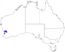 Wongan Hills boronia grows in woodland and heath in the Wongan Hills and Moora areas.[2]
