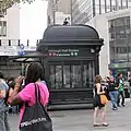 The main fare control for the IRT Eastern Parkway Line platforms is at the center of the station. On the northbound side, the overpasses have full height turnstiles leading to two staircases, one each flanking Borough Hall's main entrance on the northeast corner of Court and Joralemon Streets.[46] The stairs flanking Borough Hall retain cast-iron hoods atop granite bases, which are part of the original design. The Borough Hall station is one of two stations to retain such hoods, the other being the Wall Street station in Manhattan.[41]: 6 On the southbound side, the overpasses have small turnstile banks, leading to a token booth and two staircases, going up to the southeast corner of Court and Joralemon Streets.[41]: 4 [46] The banisters on these staircases are made of concrete since they are outside the Brooklyn Municipal Building. The mezzanine has a large set of doors leading into the Municipal Building (this entrance was closed in February 1996 due to security concerns), and a now defunct bank teller window. On the northwest corner of the mezzanine, a passage led to Borough Hall.[41]: 4