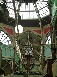 A 5,850 m2 (7,000 square yard) canopy of glass and wrought iron covers the space between ornate four storey stone buildings, topped by baroque turrets, on Southgate and Market Street, and single storey stone shops on the other sides.[5] The multi-storey buildings contain living quarters, originally for market traders and managers. Water was originally drawn from a well near the Market Street entrance. There were originally forty three outward facing shops, all butcher's, in the stone buildings, with the exception of Albion Street where there was a fish market, and three public houses on Market Street.[1] The pubs were the Wheatsheaf, later renamed the Portman and Pickles, the Saddle and the Peacock. The Portman and Pickles was named after Eric Portman and Wilfred Pickles. At the centre of the market an 18-metre (60 ft) high octagonal lantern is supported by decorative cast iron columns. Below the lantern a decorative clock was originally visible from most parts of the market, although now obscured by taller stalls.[1] Cruciform main passages are mirrored in the structure of the roof, with solid roofing above the passages creating four glass roofed quarters, each divided into three sections, glazed with rectangular panes. Flagstones used for flooring in the market, still in good condition, came from Solomon Marshall's quarry at Southowram, a business which has since grown into Marshalls plc.[10] The slope of the site is accommodated without the use of steps.[11]
