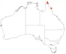 This bossiaea grows on sand dunes in heath and shrubland from the tip of Cape York Peninsula to near Cooktown.[2]