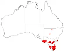 Showy bossiaea grows in forest, woodland, coastal heath and scrub, south from Bega in New South Wales, through southern Victoria to far south-eastern South Australia. It is common and widespread in Tasmania.[2][3][4][9]