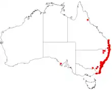 Sword bossiaea usually grows in sandy heath and is found on the coast and nearby tablelands o sout-east Queensland, New South Wales and Victoria as far west as Marlo. There is also a record from the south of South Australia.[2][3][4]