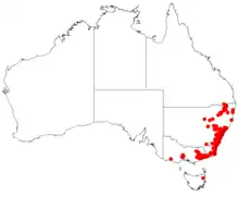Bossiaea obcordata grows in forest and heath, often on dry sandstone ridges and slopes. It is found from far south-eastern Queensland through the coast, western slopes and tablelands of eastern New South Wales, to central and eastern Victoria. Specimens recorded from Tasmania are now included in Bossiaea tasmanica.[2][3][4][10]