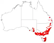 Creeping bossiaea occurs in South Australia, Victoria, Tasmania, New South Wales and Queensland in Australia. It grows in coastal heath, grassland and open-forest on a variety of soils including clay-shale, preferring wetter locations.[2][9]