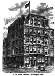 The Transcript's offices were destroyed in the Great Boston Fire of 1872. After the Great Fire The Transcript's offices on Washington Street were rebuilt and expanded.[8]