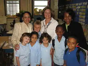 Equally economically disadvantaged, the African American communities were heavily reliant on Boston's public amenities and infrastructure as well. However, due to the racial bias and corrupt oversight, the infrastructure of Boston's African American neighborhoods paled in comparison to that offered in primarily white communities.[21] This inequality was nowhere more appalling or evident than in the neighborhood schools. In many cases, the understaffed and poorly funded schools were forced to teach with small quantities of outdated reading material and textbooks, as well as carefully rationed school supplies such as pencils, collecting them at the end of the day to ensure they would have enough. This lack of funding and support for the African American neighborhood schools was a result of the lack of proper and equal allocation of funding between white and black school districts within the Boston public school system. This primarily resulted from the racially prejudice all-white Boston public schools committee that wouldn't end up integrating until 1977 with the election of John D. O'Bryant[22] almost three full years after forced busing had begun.