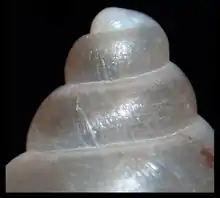 ![]() Photo of upper whorls of Bostryx fragilis showing fine, interrupted spiral lines and protoconch sculpture.[1] |