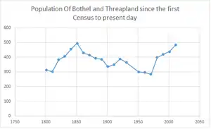 The population of Bothel and Threapland as shown in the graph shows during the early census shows a steady growth up to 495, which has been the highest the population within the parishes history. There was a period of time between 1871 and 1971, where the parish saw a decline of population from 495 to its lowest of 284, this could be explained through different events of the change of boundaries, people moving to larger towns and cities or incidents of deaths from war. The present day census shows the population at 483 and growing.[7]