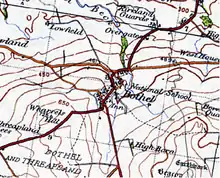 - A Historical description of Bothel by Kelly's Directory of Cumberland (1897): "Bothel-with-ThreapIand form a township in Cockermouth union. The large village of Bothel is pleasantly seated on the slope of an eminence on the Wigton and Cockermouth road, 2 ½ miles south from Baggrow railway station, 7 ½ north-by-north-east from Cockermouth, and 8 south-by-south-west from Wigton, and in the Allerdale-above-Derwent ward and petty sessional division. There is a Wesleyan chapel here, built in 1889, and a Primitive Methodist chapel, erected in 1836. Bothel Hall is now a mean farmhouse, and Threapland Hall, a building of the 17th century, is also a farmhouse. Here is a boulder called "Sampson," 21 feet long and 10 above ground; on Camp Hill are remains of a Roman camp, and interments have been met with."[4]