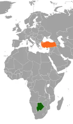 Botswana–Turkey relations are the foreign relations between Botswana and Turkey. Turkey has an embassy in Gaborone since October 15, 2014.[1]