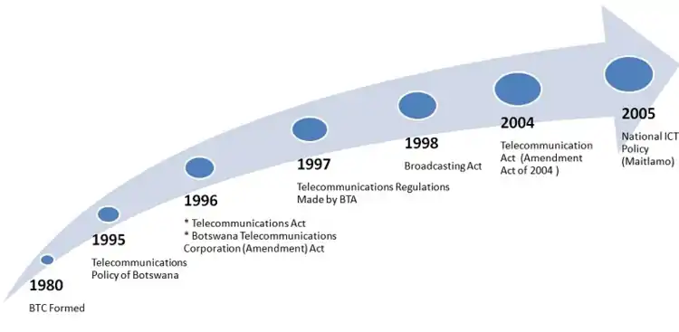 Following public concerns regarding unsatisfactory telecommunications services during the 1990s (including lack of competition in providing services, limited private-sector participation, lack of transparency in decision-making and lack of a platform for consumer complaints), the government began public consultations to liberalise the telecommunications market. In 1992 the Ministry of Works, Transport and Communications was tasked with policy transformation. The consultations culminated in the approval of the 1995 Telecommunications Policy for Botswana: the blueprint for restructuring the telecommunications sector, which embodied principles which guided the form of the government monopoly. The transformation process led to the formation of the BTA under the Telecommunications Act 1996, as passed in the National Assembly on 1 August 1996.[3]