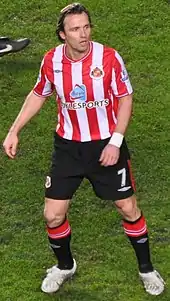 On 16 October 2009, it was announced that Zenden had signed a contract with Sunderland which tied him down until the end of the 2009–10 season.[21] Zenden signed in time to make his debut against former club Liverpool and he did an excellent job helping Sunderland to retain their one-goal lead after coming on as a substitute for the injured Lee Cattermole.[22] His Sunderland career often saw him play as a substitute without starting any matches and he had suffered an injury in between, but after recovery he was named in the squad to face his old club Chelsea at Stamford Bridge on 16 January 2010, and within less than ten minutes of coming on as a second-half substitute he scored his first goal for the club, a fine half-volley to reduce his team's deficit to 5–1, having been 4–0 down at half-time. The Black Cats eventually succumbed to a 7–2 defeat.[23] On 3 April 2010, Zenden scored his second goal for Sunderland, a left-footed volley in a 3–1 win against Tottenham Hotspur at the Stadium of Light.[24]