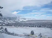 Boulder has a temperate climate typical for much of the state and receives many sunny or mostly sunny days each year. Under the Köppen climate classification, the city is considered semi-arid (Köppen BSk) or humid subtropical (Köppen Cfa), due to its relatively high yearly precipitation and average temperatures remaining above 32 °F (0 °C) year-round.[28][29][30][31] Winter conditions range from generally mild to the occasional bitterly cold, with highs averaging in the mid to upper 40s °F (7–9 °C). There are 4.6 nights annually during which the temperature reaches 0 °F (−18 °C). Because of orographic lift, the mountains to the west often dry out the air passing over the Front Range, often shielding the city from precipitation in winter, though heavy falls may occur. Snowfall averages 88 inches (220 cm) per season, but snow depth is usually shallow; a strong warming sun due to the high elevation can quickly melt snow cover during the day, and Chinook winds bring rapid warm-ups throughout the winter months. Summers are warm, with frequent afternoon thunderstorms. Roughly 30 days reach 90 °F (32 °C) or above each year.[32] Diurnal temperature variation is typically large due to the high elevation and semi-arid climate. Daytime highs are generally cooler than those of most Colorado cities with similar elevations. However, Boulder's nighttime lows are mild, particularly during winter. The average January temperature of 34.5 °F (1.4 °C) is the warmest of any city in the state.[33] The highest recorded temperature of 104 °F (40 °C) occurred most recently on June 25, 2012.[34] The record low was −33 °F (−36 °C) on January 17, 1930. The coldest high temperature, −12 °F (−24 °C), was recorded on February 4, 1989, while the warmest overnight low was recorded on July 20, 1998, with a temperature of 82 °F (28 °C)[35]